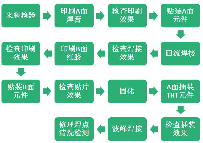 SMT加工雙面混裝批量生產(chǎn)貼裝工藝流程如下: